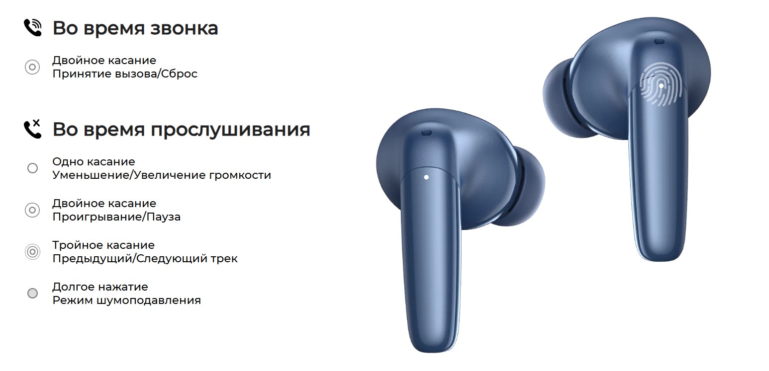 Наушники Buds 4 имеют простое и понятное сенсорное управление как для прослушивания музыки и другого контента, так и для звонков.